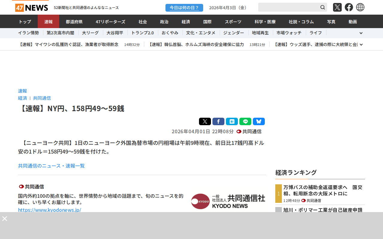 【速報】NY円、158円49~59銭|47NEWS(よんななニュース)