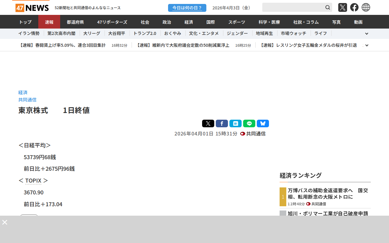 このページは、2026年4月1日の東京株式市場の終値を報じた速報記事です。日経平均株価(225種)は前日比2675円96銭高の5万3739円68銭で取引を終えました。記事は共同通信による経済速報であり、国内外約100の拠...