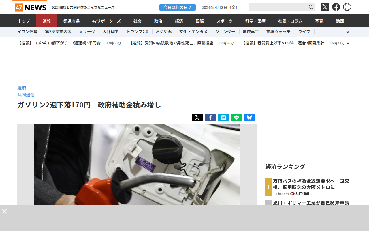 ガソリン2週下落170円 政府補助金積み増し|47NEWS(よんななニュース)