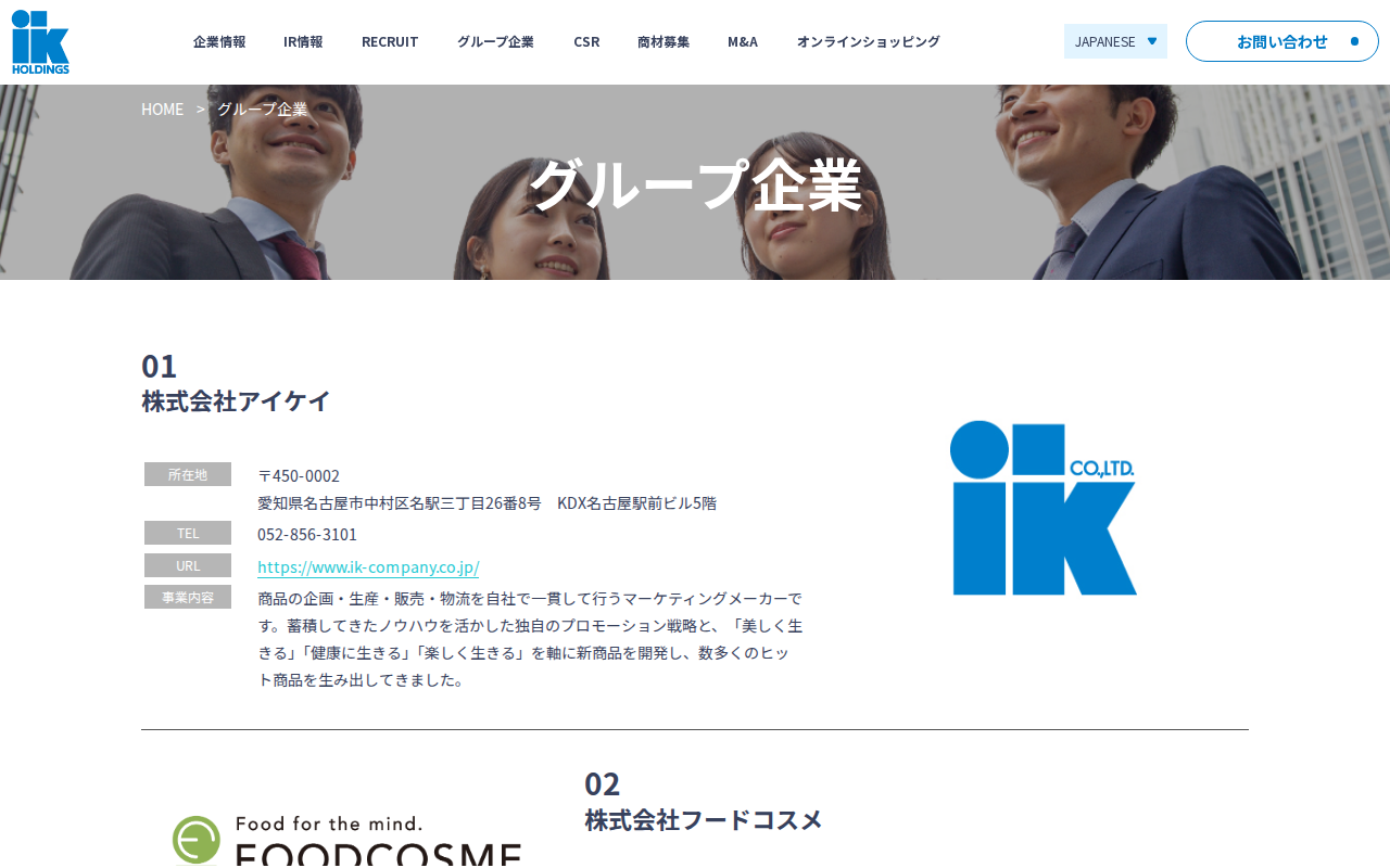 このページは、株式会社IKホールディングスのコーポレートサイトです。同社はアイケイグループとして、独自のプロモーション戦略で商品の企画・製造・物流を一貫して行うマーケティングメーカーです。セールスマーケティング事業とダイ...