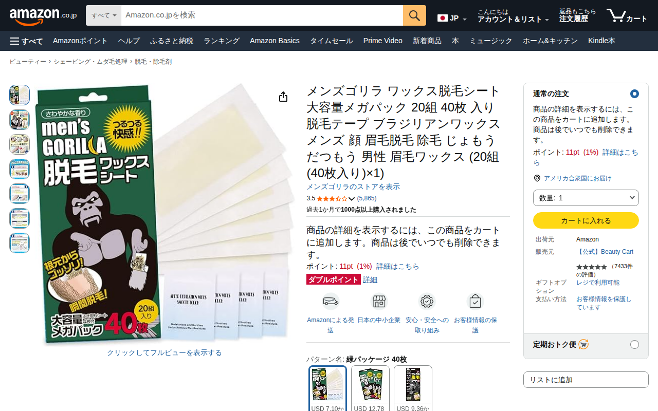 このページはAmazon.co.jpで販売されている「メンズゴリラ ワックス脱毛シート 80枚セット」の商品ページです。40枚×2個セットのブラジリアンワックスで、男女兼用で顔や眉毛の脱毛に使用できます。販売者は【公式】...