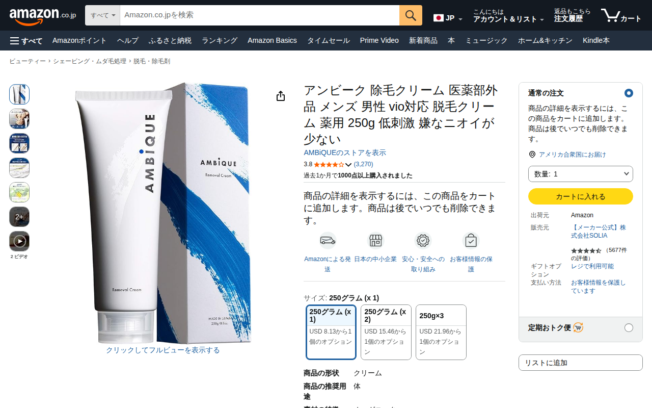 このページはアンビークの除毛クリームの商品ページです。医薬部外品で男性向けのメンズ脱毛クリームであり、250g入りで低刺激処方です。ビタミンC配合で肌ケア成分を含み、9つの無添加で敏感肌にも対応しています。ボディからVI...