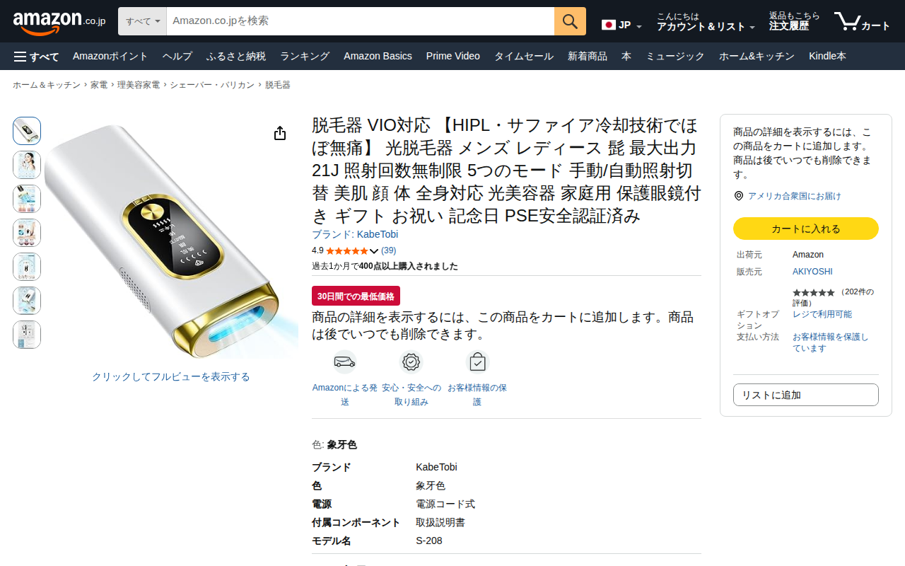 このページはAmazonで販売されているKabeTobi製の家庭用光脱毛器の商品情報です。最新HIPL光技術とサファイア冷却システムを搭載し、照射と同時に肌を冷却して痛みを軽減します。最大21Jのハイパワー出力でVIO・...