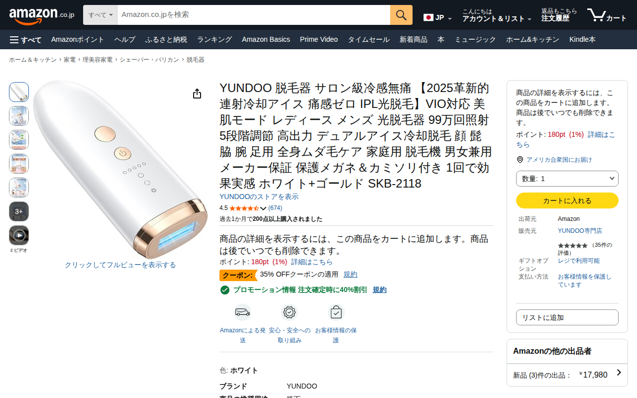Amazon | YUNDOO 脱毛器 サロン級冷感無痛 【2025革新的連射冷却アイス 痛感ゼロ IPL光脱毛】VIO対応 美肌モード レディース メンズ 光脱毛器 99万回照射 5段階調節 高出力 デュアルアイス冷却脱毛 顔 髭 脇 腕 足用 全身ムダ毛ケア 家庭用 脱毛機 男女兼用 メーカー保証 保護メガネ&カミソリ付き 1回で効果実感 ホワイト+ゴールド SKB-2118 | YUNDOO | 脱毛器 通販