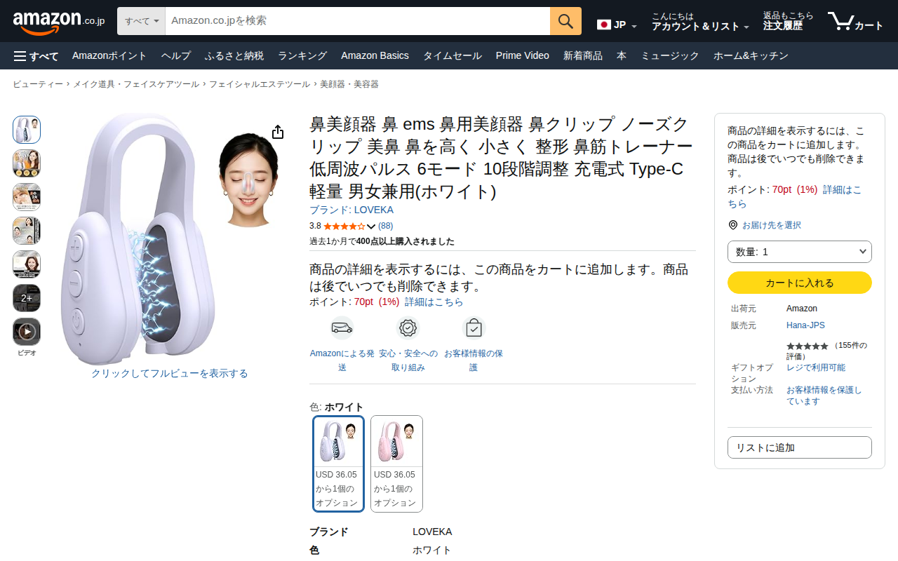 このページはAmazonで販売されている鼻美顔器の商品ページです。LOVEKAブランドの鼻用EMS美顔器で、低周波パルス技術を使用して鼻周りの筋肉に直接アプローチします。6つのモード(たたく、引っ張る、締め付け、捏ねる、...