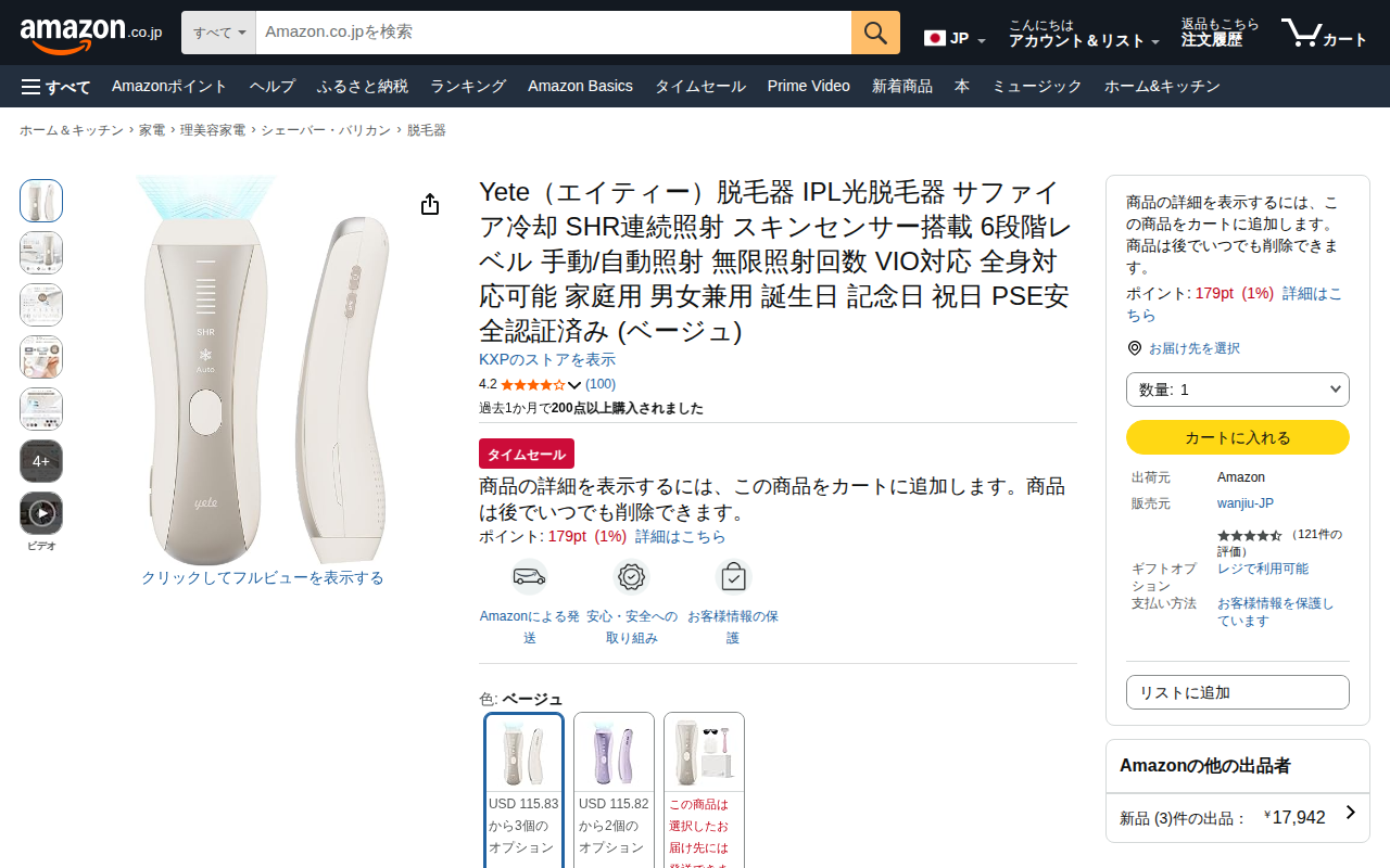 Amazon | Yete(エイティー)脱毛器 IPL光脱毛器 サファイア冷却 SHR連続照射 スキンセンサー搭載 6段階レベル 手動/自動照射 無限照射回数 VIO対応 全身対応可能 家庭用 男女兼用 誕生日 記念日 祝日 PSE安全認証済み (ベージュ) | KXP | 脱毛器