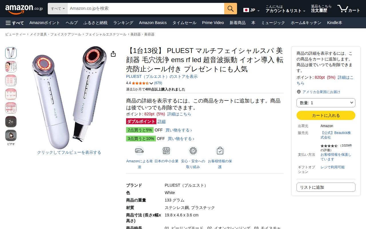 このページは、PLUESTのマルチフェイシャルスパ美顔器の商品情報を掲載しています。1台13役で、ピーリング、イオンクレンジング、モイスチャー、LED、EMS、RFなど6つのモードを備えており、毛穴洗浄から顔のリフトアッ...