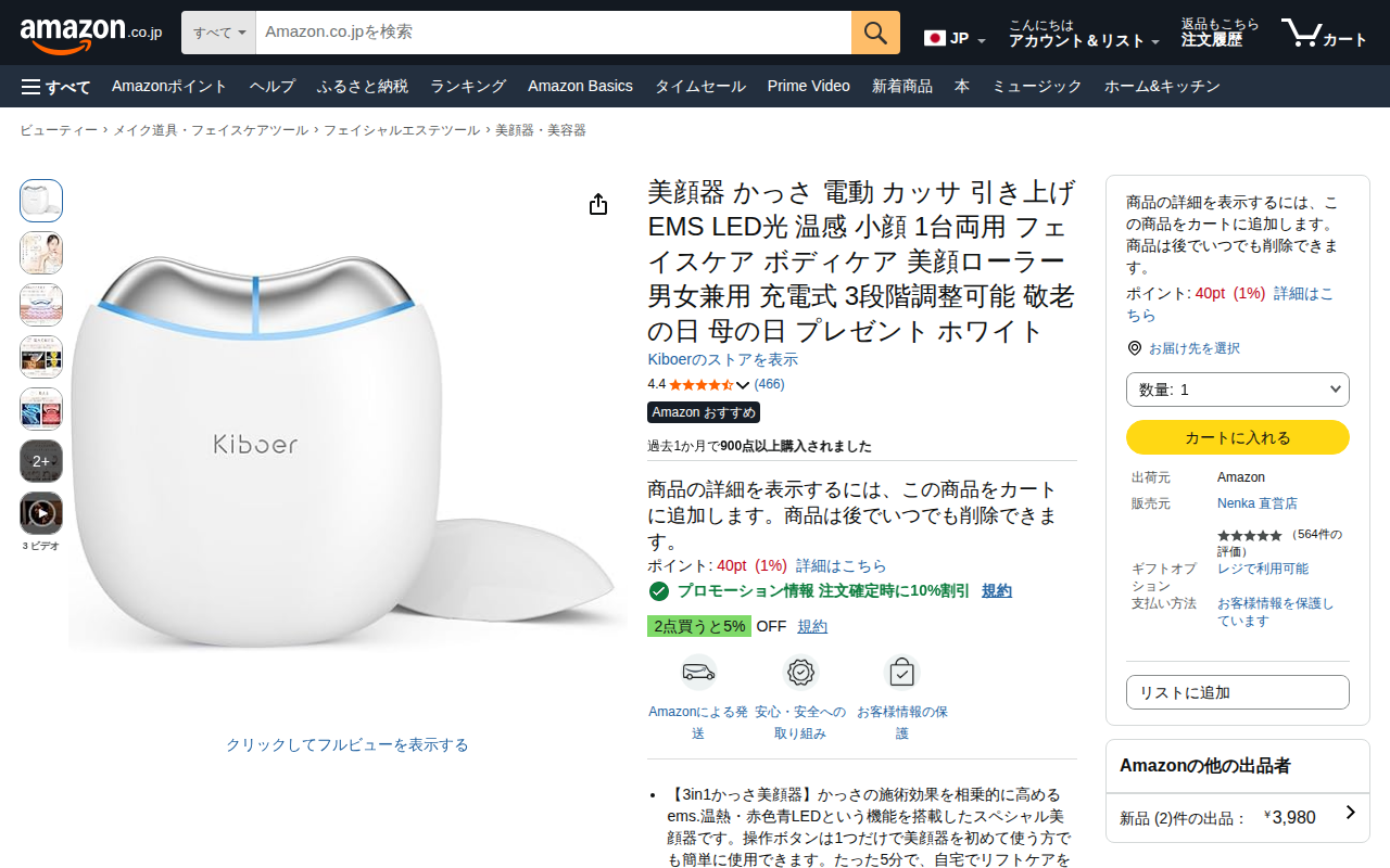 このページはKiboer製の電動かっさ美顔器の商品ページです。EMS、温感、赤色・青色LED機能を搭載した3in1の美顔器で、自宅で手軽にリフトケアが可能です。操作ボタンは1つシンプルで、初心者でも使いやすく、わずか5分...