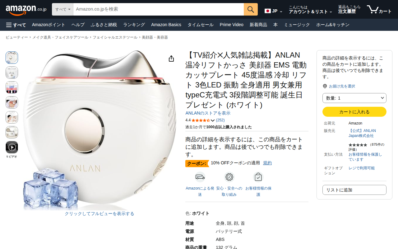 このページはAmazonで販売されているANLAN温冷リフトかっさ美顔器の商品ページです。45度温感、冷却、EMS、3色LED、振動機能を備えた7役の多機能美顔器で、顔から全身まで使用できます。業界初のクール機能搭載で、...