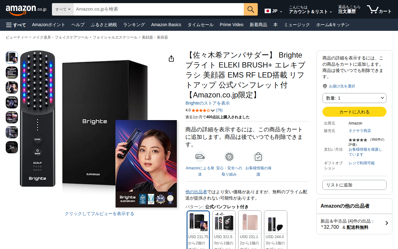 このページはAmazon.co.jpで販売されている、佐々木希がアンバサダーを務める「Brighte ELEKI BRUSH+」という美顔器の商品ページです。EMS、RF、LED搭載でリフトアップ効果が期待でき、価格は3...