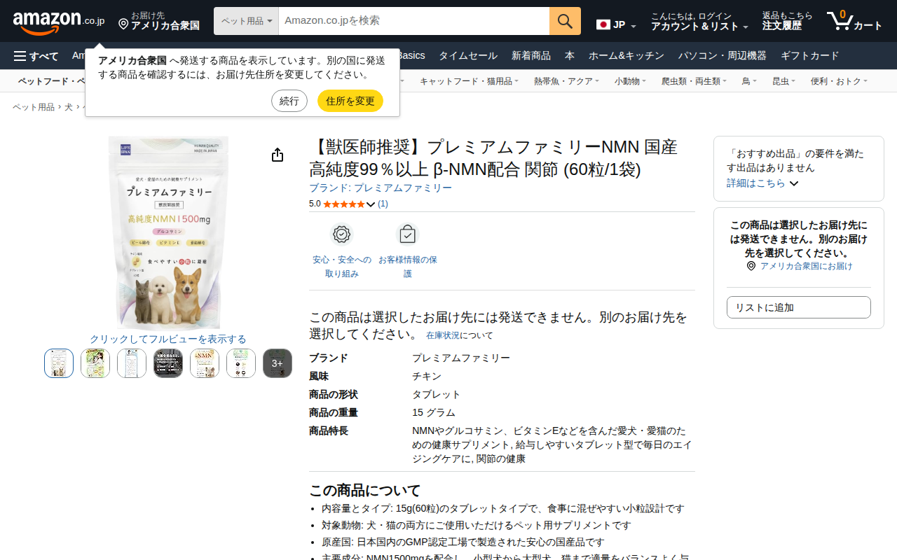 このページは、Amazon.co.jpで販売されている犬・猫用健康サプリメント「プレミアムファミリーNMN」の商品ページです。獣医師推奨の国産品で、高純度99%以上のβ-NMN1500mgを配合しており、グルコサミンやビ...