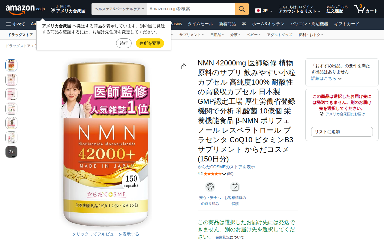 このページはAmazonで販売されるNMNサプリメント商品の紹介ページです。からだCOSMEブランドの150日分のサプリで、1本に42000mgのNMNを配合し、1日1粒で280mgのNMN摂取が可能です。GMP認定工場...