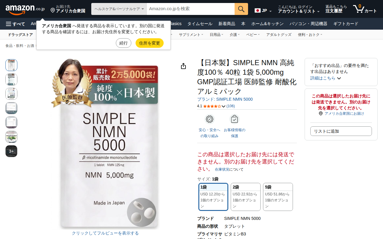 このページは、Amazon.co.jpで販売されている「SIMPLE NMN 高純度100% 40粒」の商品紹介ページです。日本製のNMNサプリメントで、1袋5,000mg含有、GMP認証工場で製造されています。医師監修...