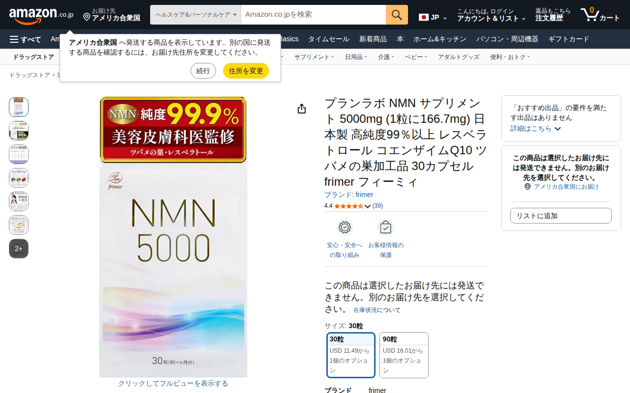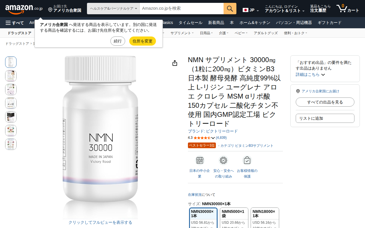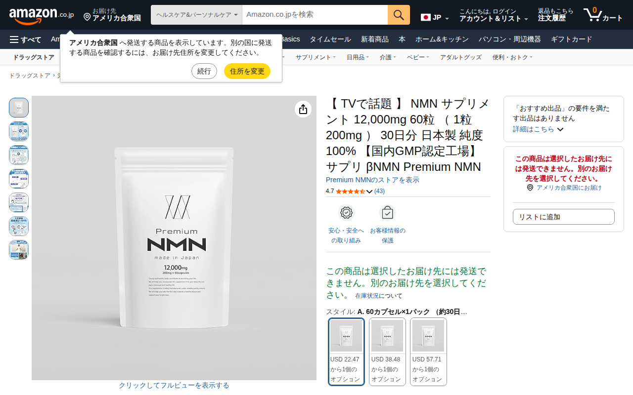 このページは、Amazon.co.jpで販売されているPremium NMNのNMNサプリメント商品ページです。1粒200mgの高配合NMNを60粒(30日分)含むカプセル型サプリメントで、日本製・純度100%・GMP認...