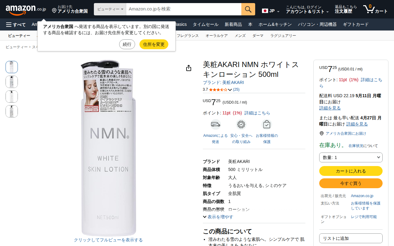 このページは、Amazon.co.jpで販売されている美粧AKARIのNMNホワイトスキンローション500mlの商品ページです。全肌質向けのアルコールフリー化粧水で、うるおいとシミケアが特徴。澄み渡る雪のような素肌へと導...