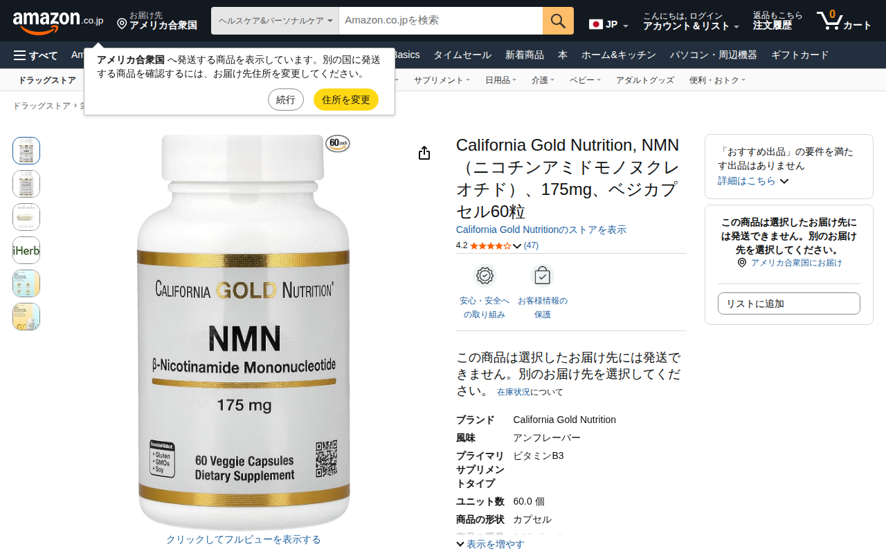 このページはAmazonで販売されているCalifornia Gold Nutrition製のNMNサプリメント商品です。1粒あたりNMN(ニコチンアミドモノヌクレオチド)175mgを含む、60粒入りのベジカプセルです。...