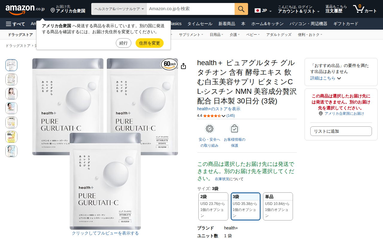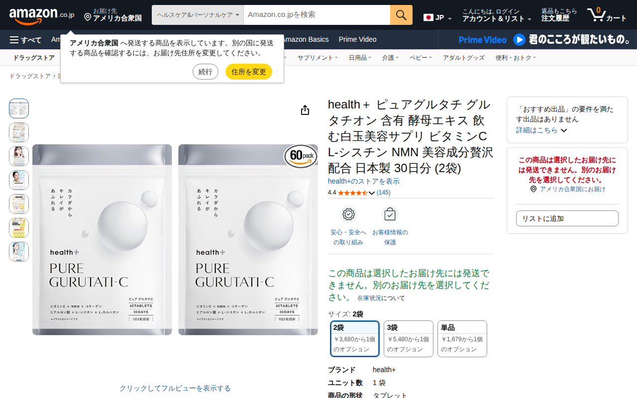 このページはAmazonで販売されているhealth+ブランドの美容サプリメント「ピュアグルタチ」の商品ページです。グルタチオン含有酵母エキスを1袋6000mg高配合し、ビタミンCも3000mg含有しています。L-シスチ...