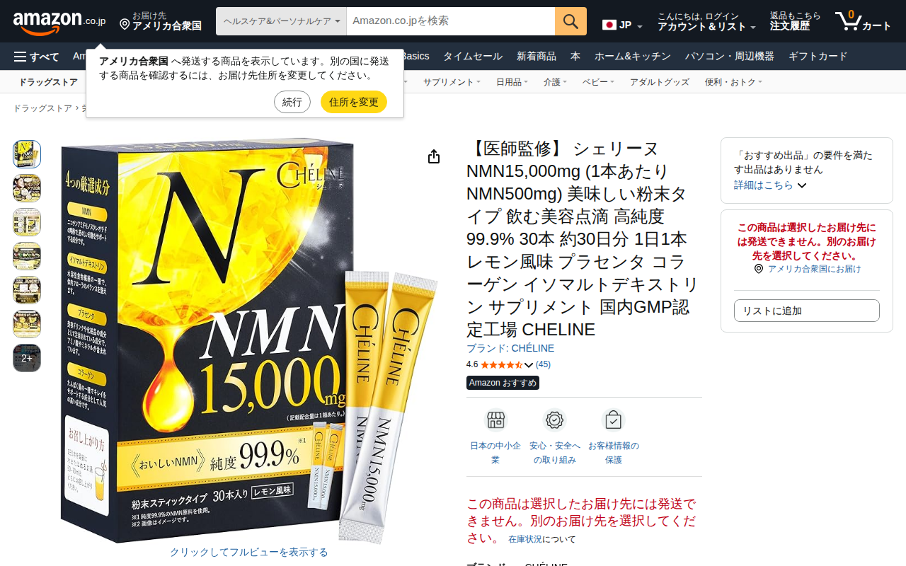 このページはAmazonで販売されている医師監修のNMNサプリメント「シェリーヌ」の商品紹介です。高純度99.9%のNMN15,000mg(1本あたり500mg)を含む粉末タイプで、30本約30日分です。レモン風味で、コ...