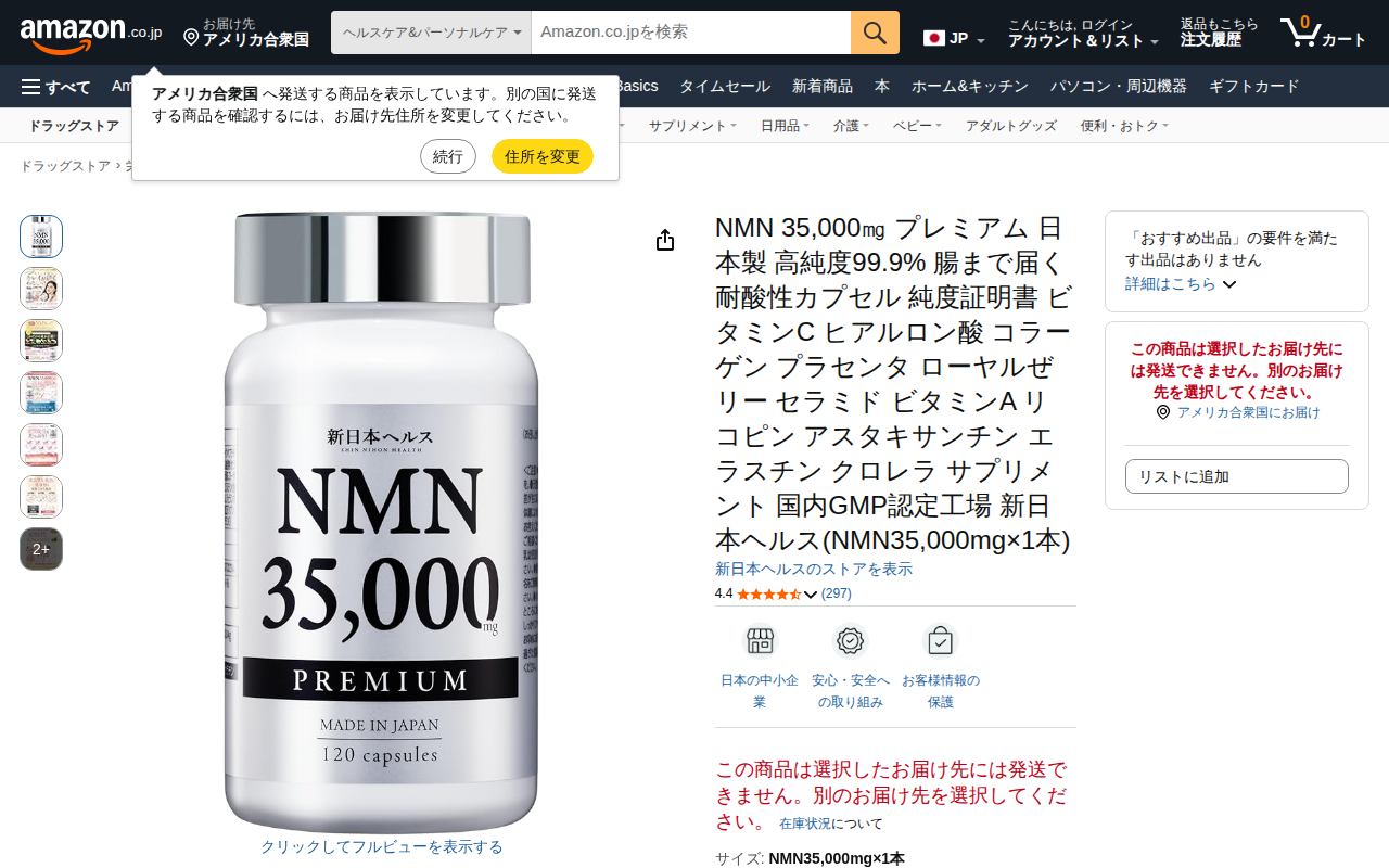 このページは、新日本ヘルスが販売するNMNサプリメント「NMN35,000㎎ プレミアム」の商品ページです。高純度99.9%のNMNを1本に35,000mg配合した120カプセル入りのサプリメントです。NMNは年齢ととも...