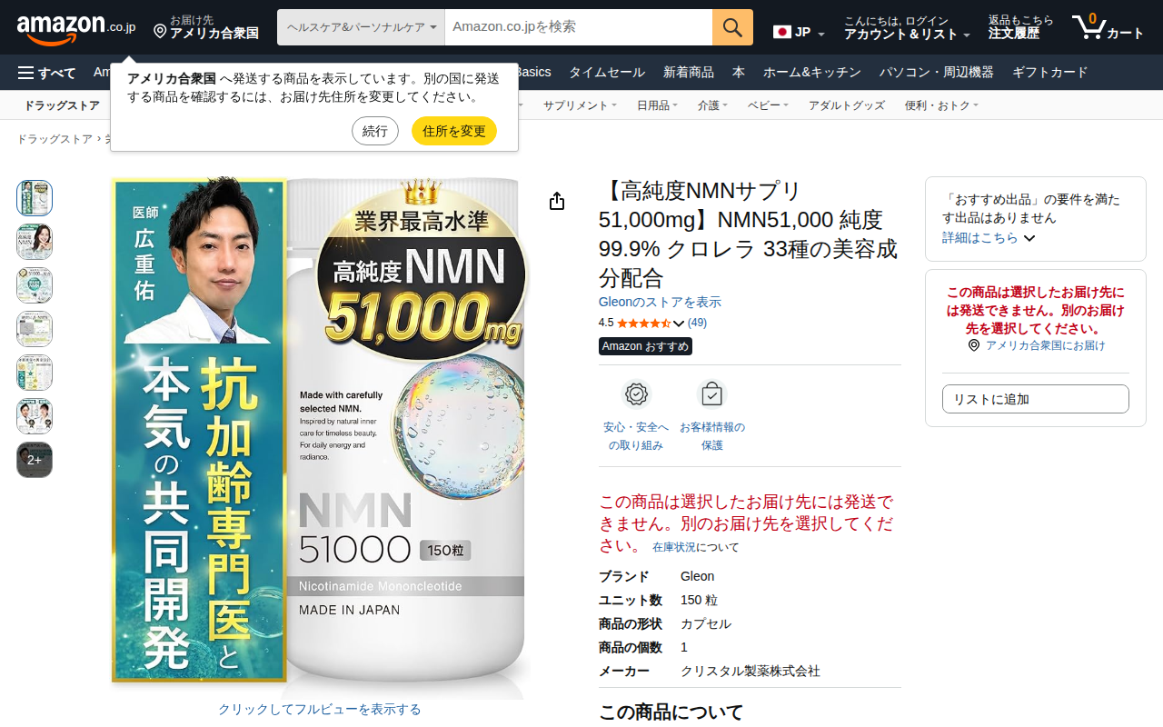 このページはGleon製のNMNサプリメント「NMN51,000」の商品紹介ページです。純度99.9%のNMNを51,000mg配合したカプセル型サプリで、クロレラを含む33種の美容成分が配合されています。150粒入り、...