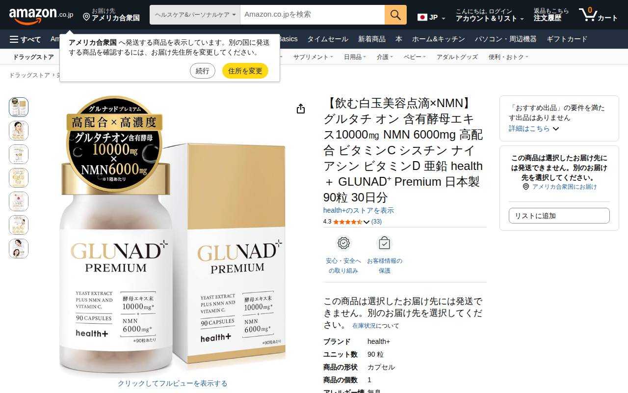 このページはAmazonで販売されている「GLUNAD+ Premium」という美容サプリメントの商品ページです。health+ブランドの日本製サプリで、酵母エキス10000㎎とNMN 6000㎎を高配合しています。ビタ...