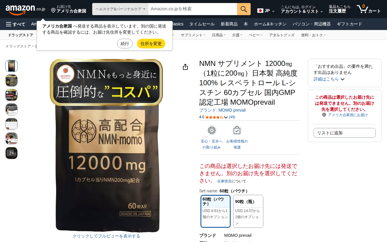 このページはAmazonで販売されているNMNサプリメント商品の紹介ページです。MOMO prevailブランドの製品で、1袋に12,000mgのNMNを配合し、1粒あたり200mgが摂取できます。高純度100%で、国内...
