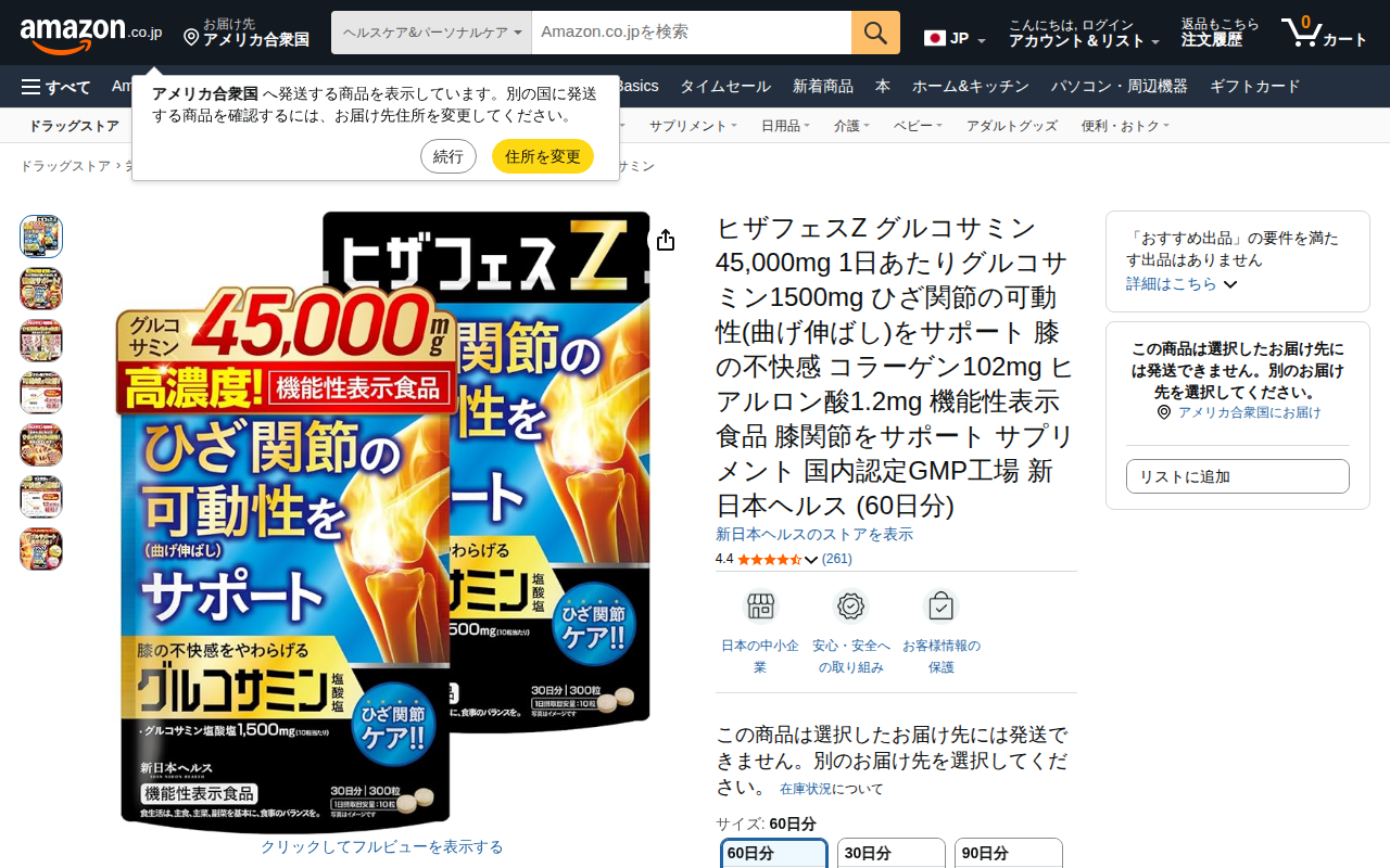 このページはAmazonで販売されている「ヒザフェスZ グルコサミン」のサプリメント商品ページです。新日本ヘルス製で、グルコサミン塩酸塩1500mg/日を配合した機能性表示食品です。ひざ関節の曲げ伸ばしの可動性をサポート...