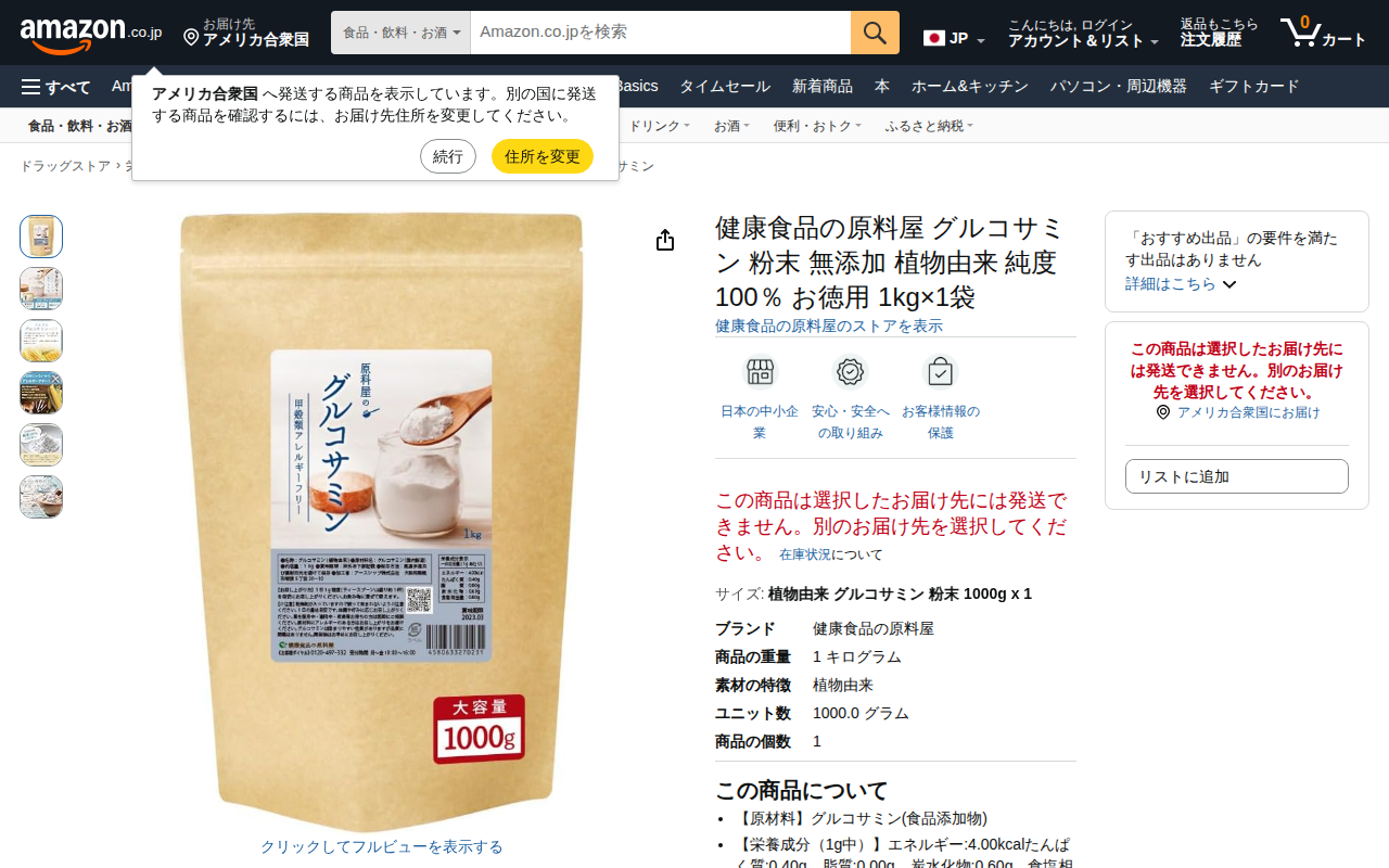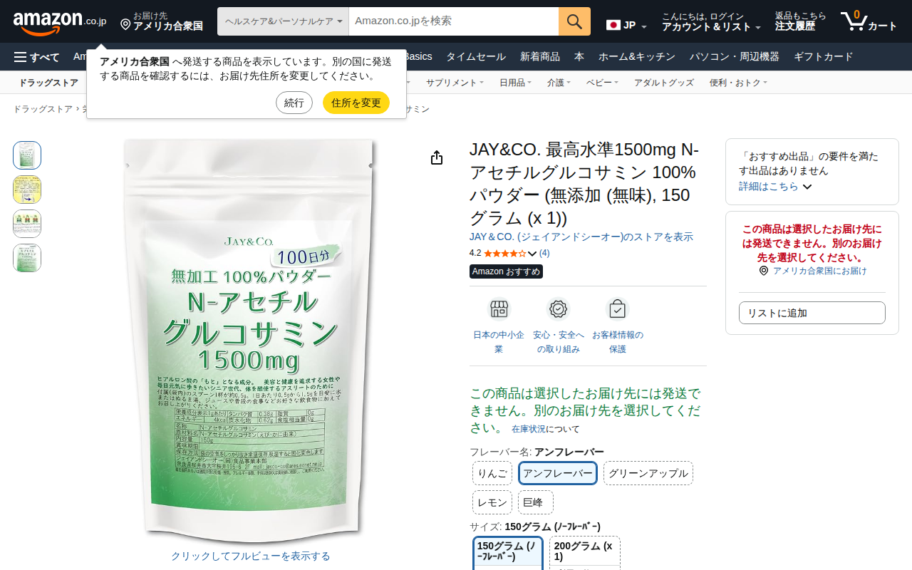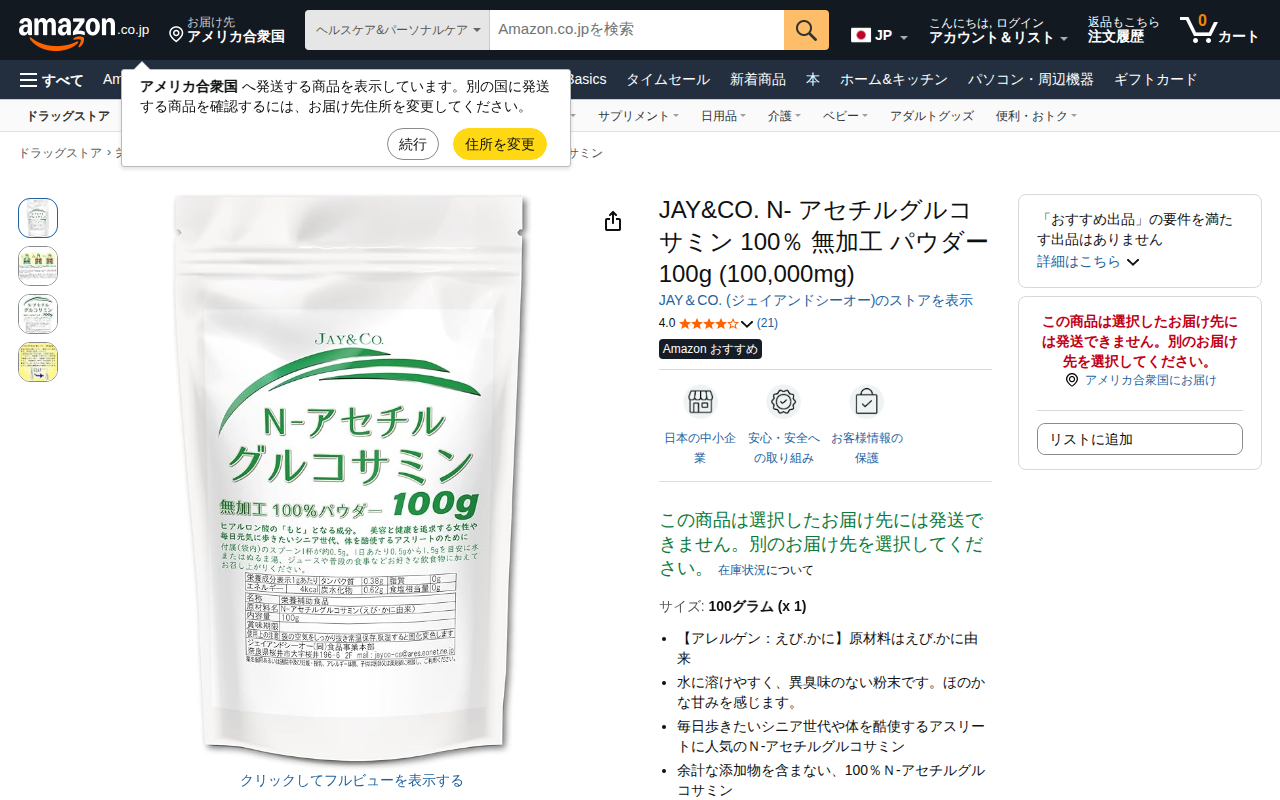 このページはAmazonで販売されているJAY&CO.のN-アセチルグルコサミン100%パウダーの商品ページです。150グラム入りの無添加・無味の粉末サプリメントで、1500mg配合されています。水に溶けやすく、えび・か...