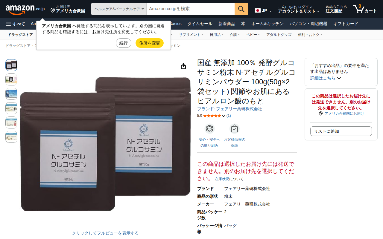 このページはAmazonで販売されている国産無添加の発酵グルコサミン粉末商品の紹介です。フェアリー薬研株式会社製のN-アセチルグルコサミンパウダーで、100g(50g×2袋セット)の商品です。体内に存在する成分で、通常の...