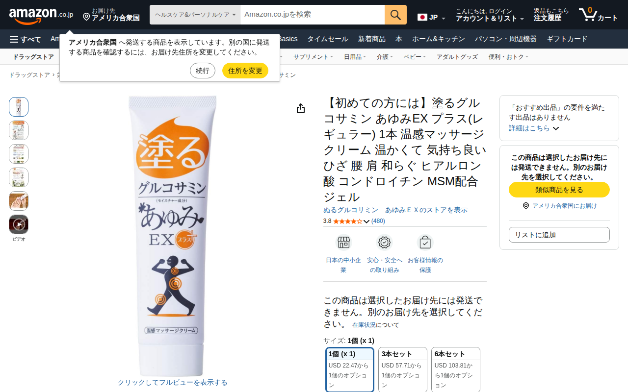 このページは、Amazonで販売されている「塗るグルコサミン あゆみEX プラス」という温感マッサージクリームの商品情報ページです。100g入りで約30日分のこの商品は、グルコサミン、プロテオグリカン、コンドロイチン、ヒ...
