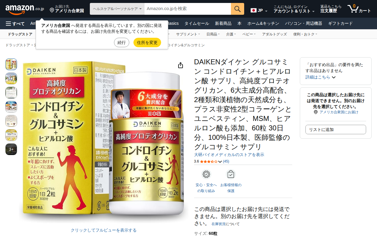 このページは、大研バイオメディカルが販売するDAIKENグルコサミンサプリメントの商品紹介ページです。グルコサミン、コンドロイチン、プロテオグリカン、非変性2型コラーゲン、ユニベスティン、MSM、ヒアルロン酸など6大主成...