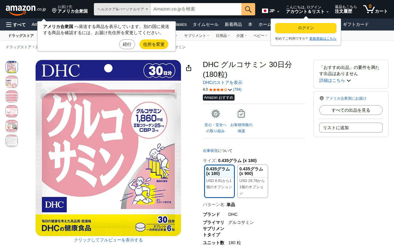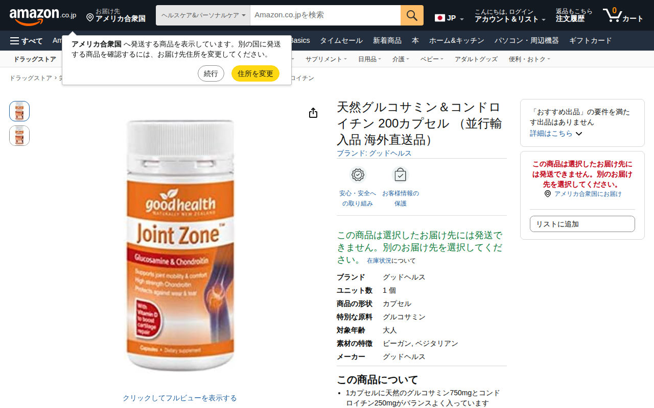 このページはAmazonで販売されているグッドヘルス製の天然グルコサミン&コンドロイチンサプリメント(200カプセル)の商品ページです。1カプセルにグルコサミン750mgとコンドロイチン250mgが配合されており、ニュー...