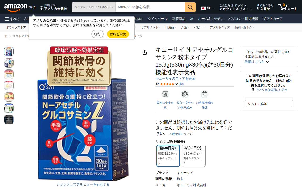 このページは、キューサイが販売するN-アセチルグルコサミンZ粉末タイプのサプリメント商品ページです。30包入り(約30日分)で、機能性表示食品として届出されています。関節軟骨成分の分解を抑え、膝や股などの関節軟骨の維持に...