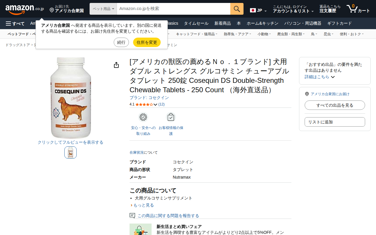 このページはAmazon.co.jpで販売されている犬用サプリメント商品の紹介ページです。Cosequin DS(コセクイン ダブル ストレングス)というグルコサミンチューアブルタブレット250錠で、アメリカの獣医が推奨...