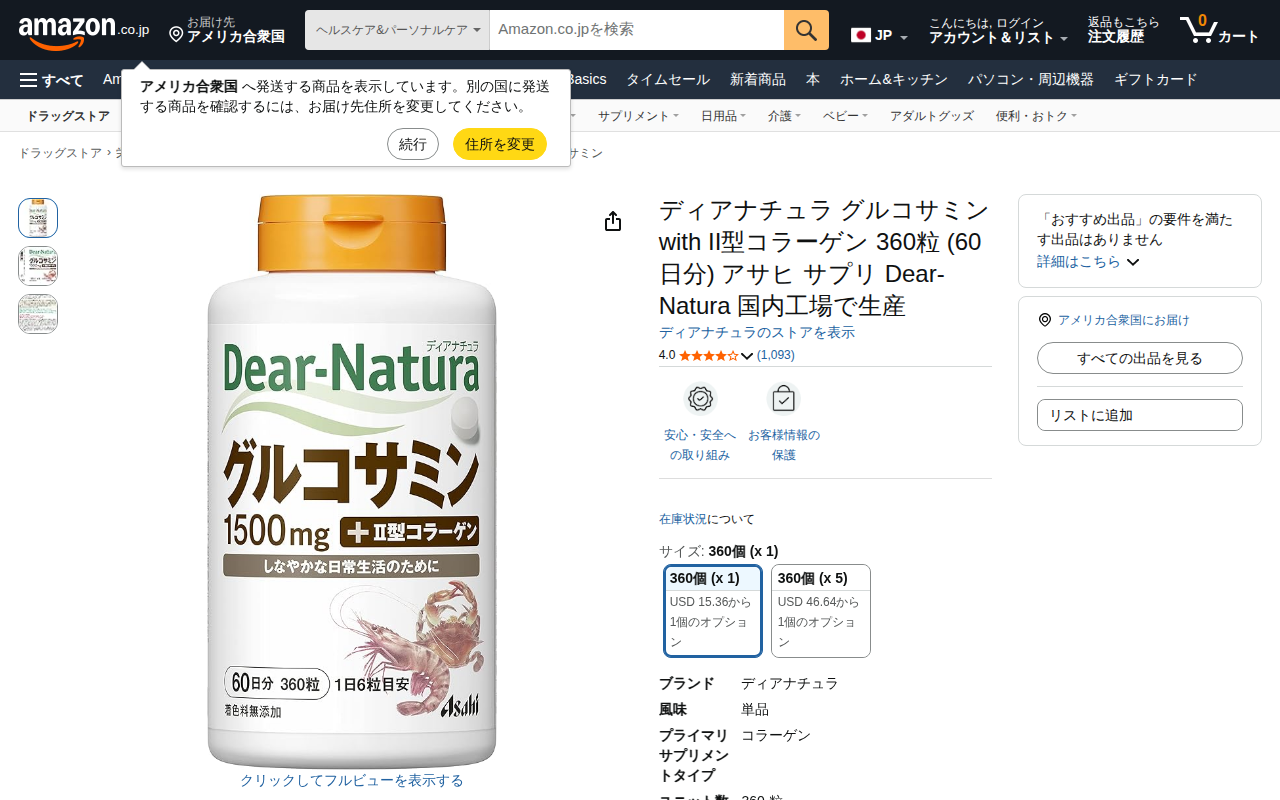 このページは、アサヒのディアナチュラ「グルコサミン with II型コラーゲン」360粒(60日分)というサプリメント商品の紹介ページです。日本国内工場で生産された本製品は、グルコサミンとII型コラーゲン含有鶏軟骨エキス...