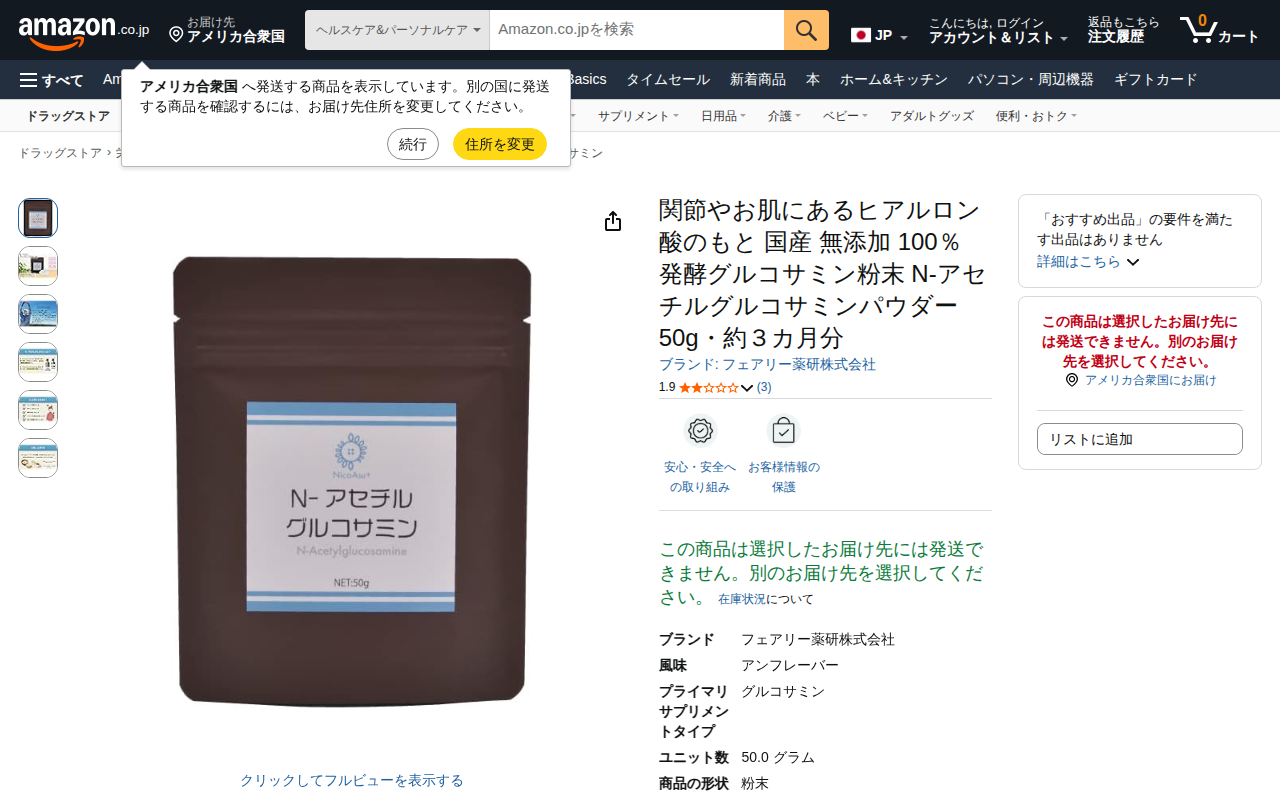 このページはAmazonで販売されているフェアリー薬研株式会社の発酵グルコサミン粉末(N-アセチルグルコサミンパウダー)の商品ページです。50g約3カ月分の国産無添加サプリメントで、ほんのり甘い粉末形状です。体内に存在す...