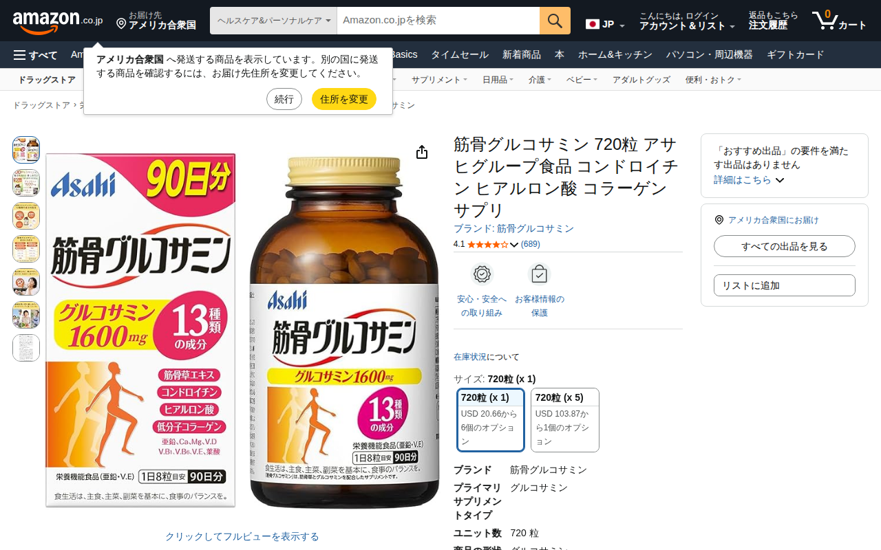 このページはアサヒグループ食品の「筋骨グルコサミン720粒」のAmazon商品ページです。グルコサミン1600mg、コンドロイチン、ヒアルロン酸、低分子コラーゲン、カルシウム、マグネシウム、各種ビタミンを含むサプリメント...