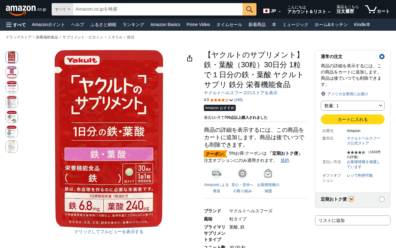 このページは、ヤクルトヘルスフーズが販売する鉄・葉酸サプリメントの商品ページです。30粒入りで30日分であり、1粒で1日分の鉄6.8mgと葉酸240μgを摂取できます。栄養機能食品として販売されており、成人向けの粒タイプ...