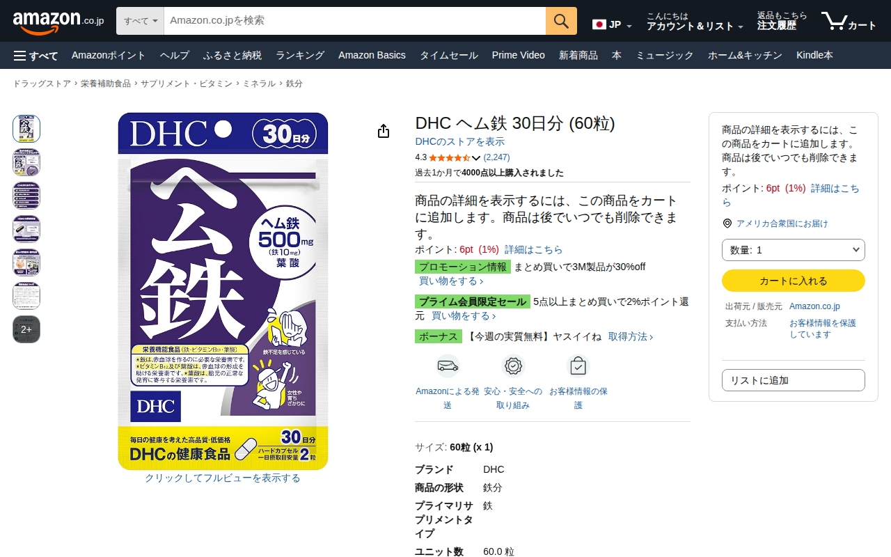 このページはDHCのヘム鉄サプリメント商品の紹介です。30日分60粒入りで、動物性食品に含まれるヘム鉄を主成分としています。鉄・ビタミンB12・葉酸の3項目で栄養機能食品の基準を満たしており、お茶やコーヒーのタンニンによ...