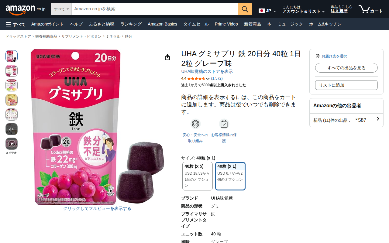 このページはAmazonで販売されているUHA味覚糖のグミサプリ鉄製品の商品ページです。グレープ味で40粒入り、1日2粒を目安に摂取します。価格は587円から。ブランド評価は4.4つ星で1,572件のレビューがあり、過去...