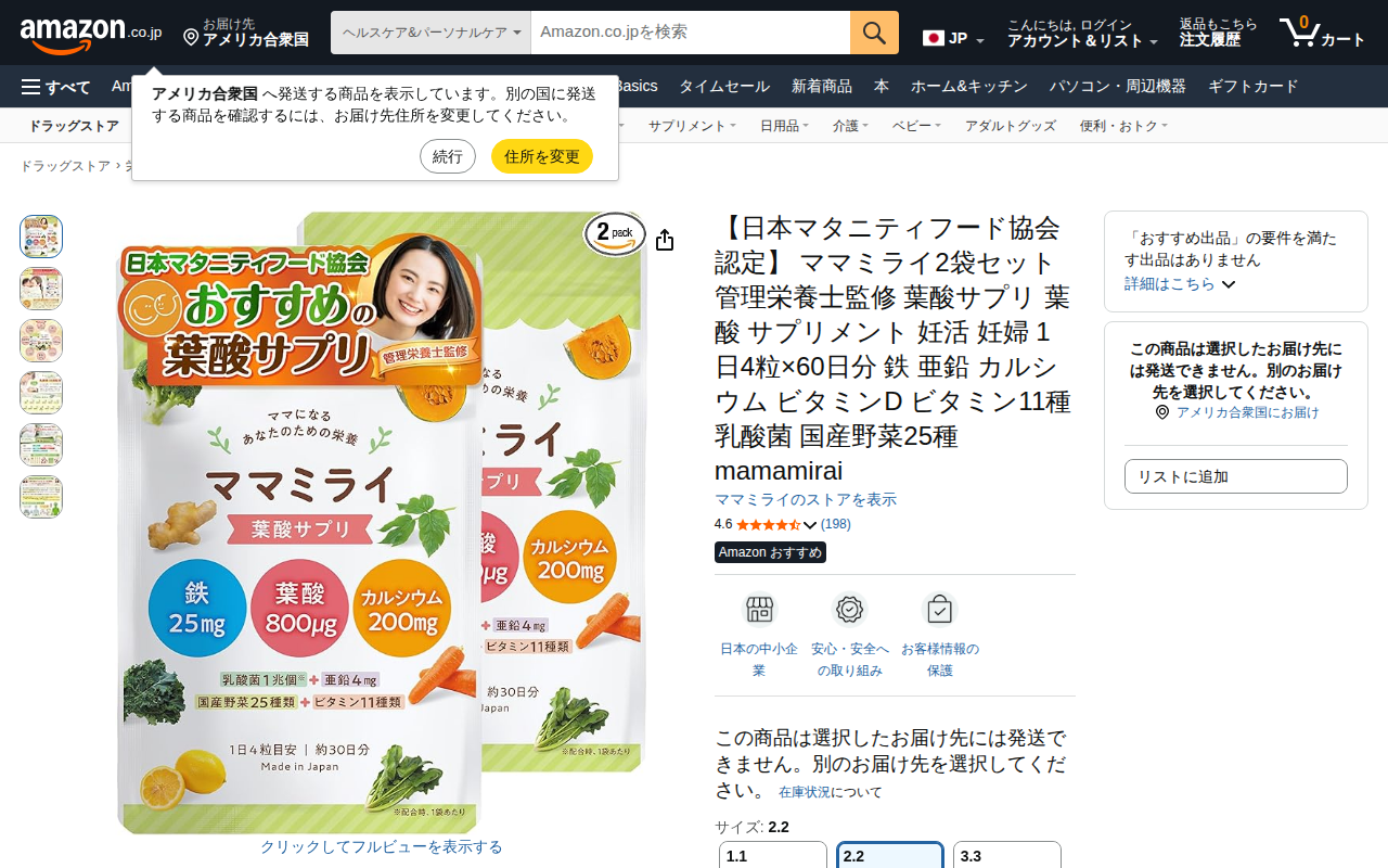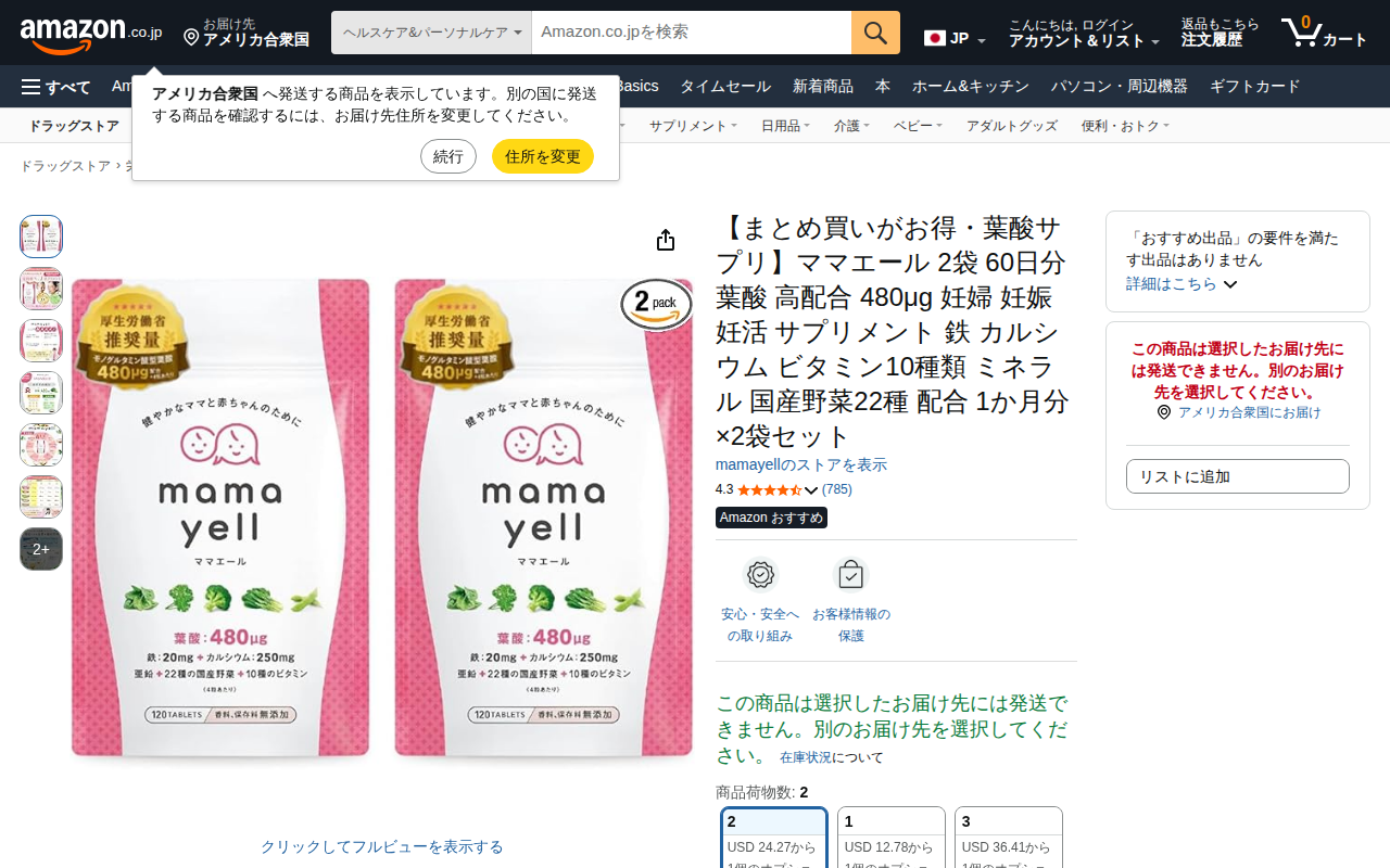このページはAmazon.co.jpで販売されている「ママエール」という葉酸サプリメントの商品ページです。妊活から産後まで必要な栄養成分を配合した2袋60日分のセット商品を紹介しており、葉酸480μg、鉄分20mg、カル...