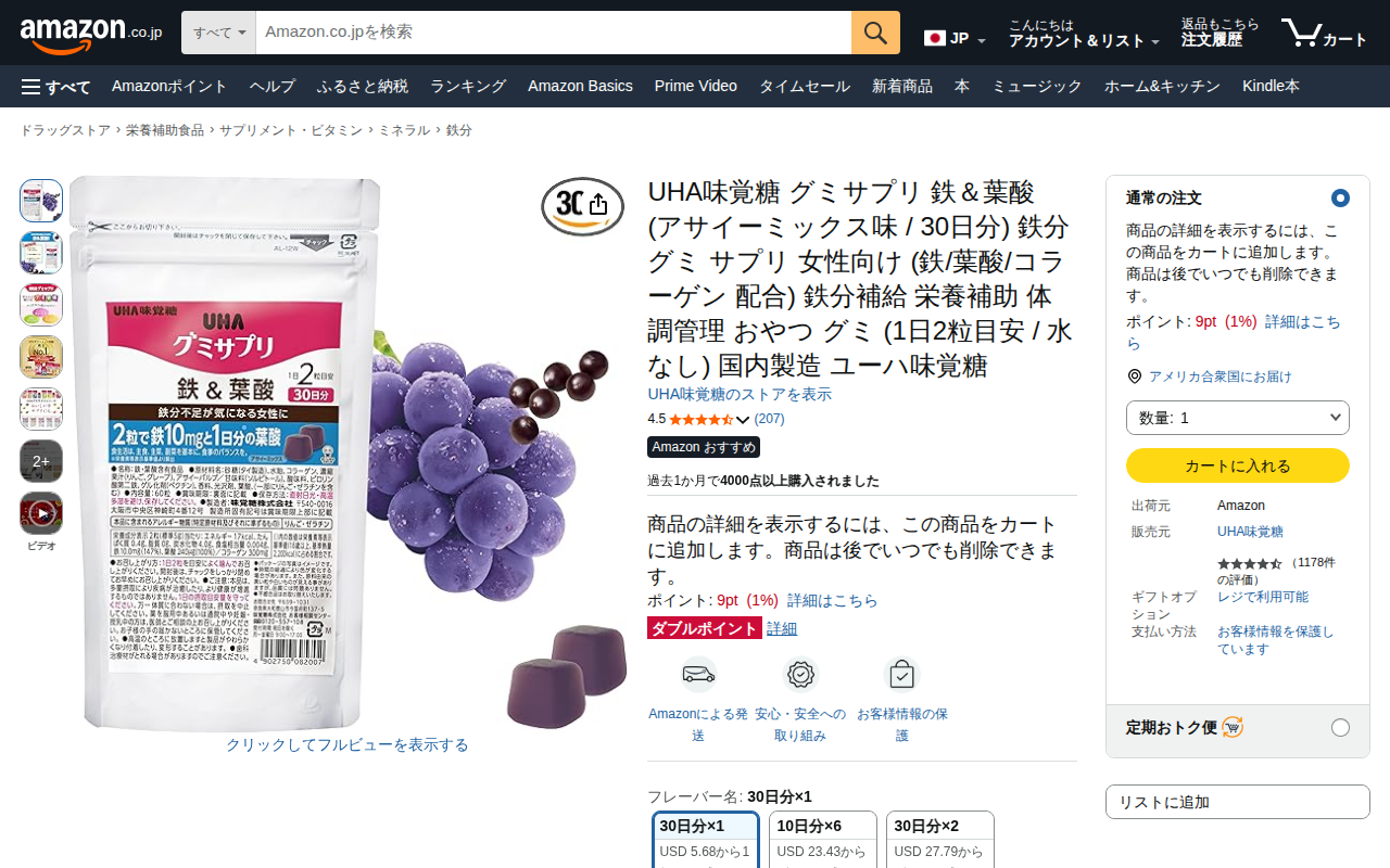 このページはUHA味覚糖のグミサプリ「鉄&葉酸」の商品ページです。アサイーミックス味で30日分(1日2粒目安)の栄養補助食品で、鉄10mg、葉酸240μg、コラーゲンを配合しています。女性向けで、水なしで食べられるグミ形...