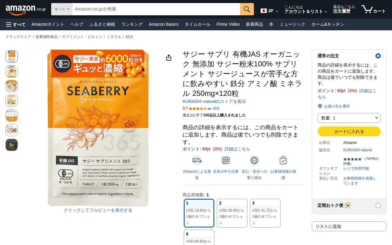 このページはAmazonで販売されているサジー有機JASサプリメントの商品ページです。KURASHI natural社による250mg×120粒の無添加サプリで、有機JAS認定を受けています。サジーはビタミン・ミネラル・...