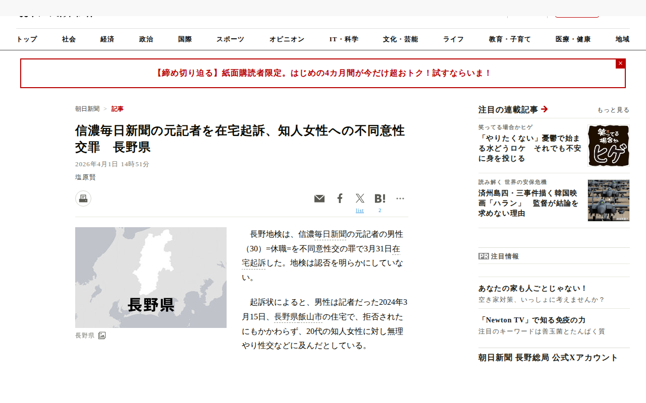信濃毎日新聞の元記者を在宅起訴、知人女性への不同意性交罪 長野県 [長野県]:朝日新聞