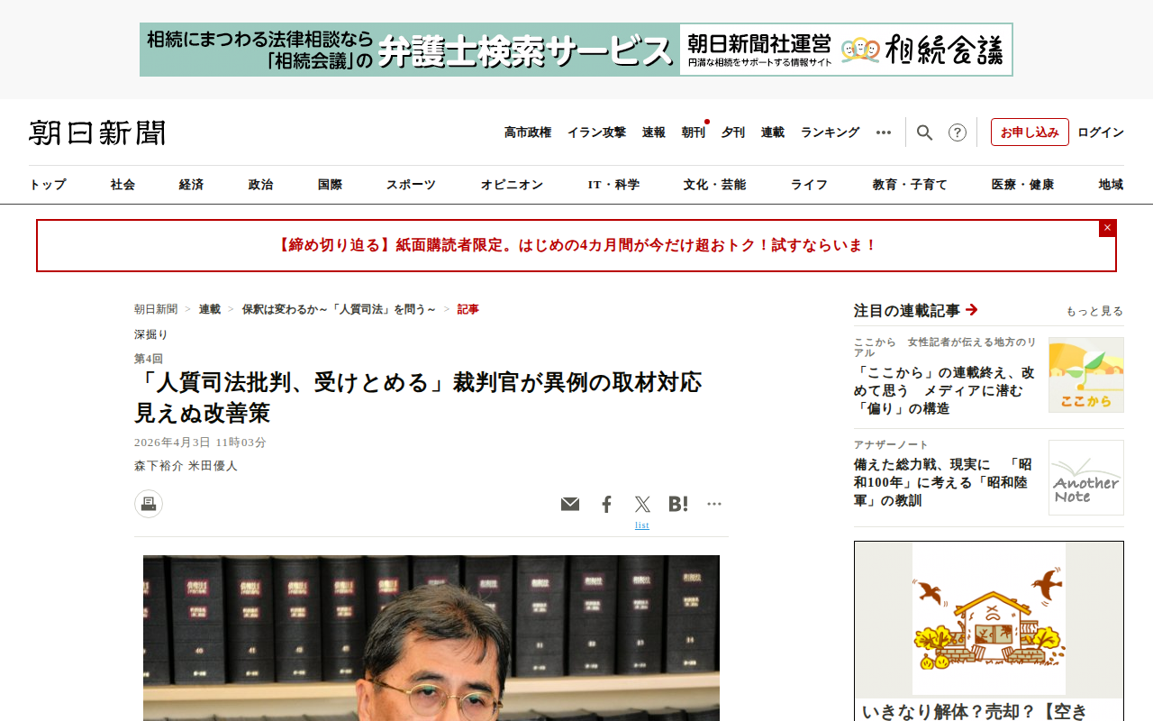このページは、東京地裁の平出喜一所長代行が朝日新聞のインタビューに応じた記事である。現役裁判官が実務について取材に応じるのは異例。無罪を主張すると保釈が認められにくく身体拘束が長引く「人質司法」批判について、平出裁判官は...