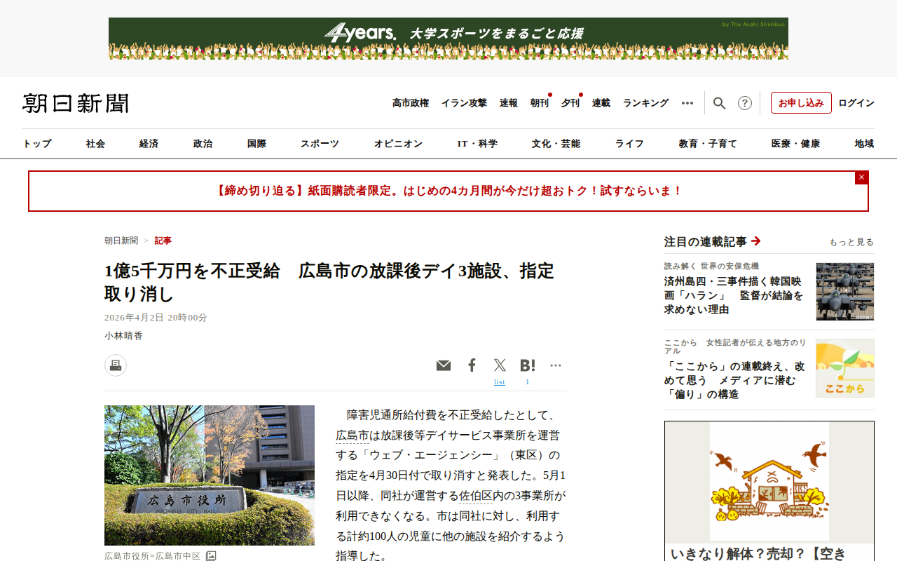 このページは、広島市の放課後等デイサービス事業所「ウェブ・エージェンシー」が障害児通所給付費を不正受給した事件を報じている。同社は2020年10月から2024年9月にかけて、提出書類に虚偽記載をして約1億5千万円を不正に...