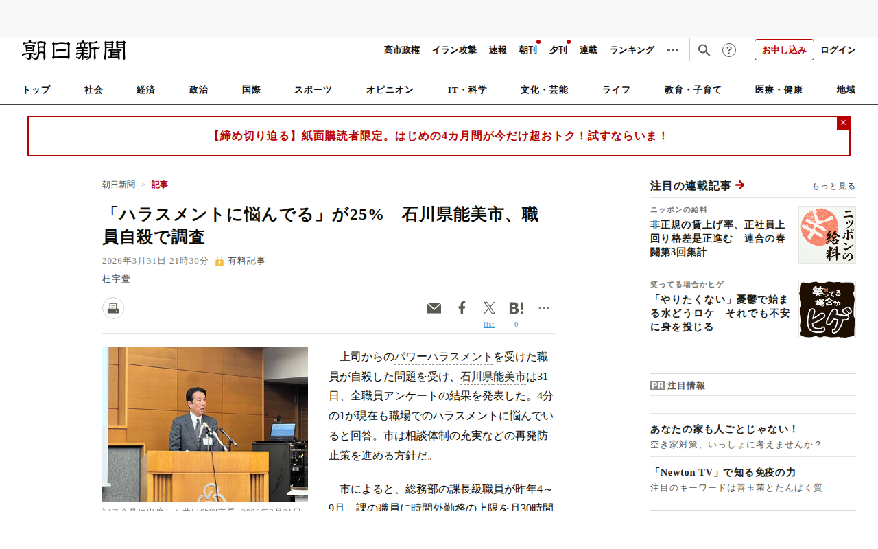 「ハラスメントに悩んでる」が25% 石川県能美市、職員自殺で調査 [石川県]:朝日新聞