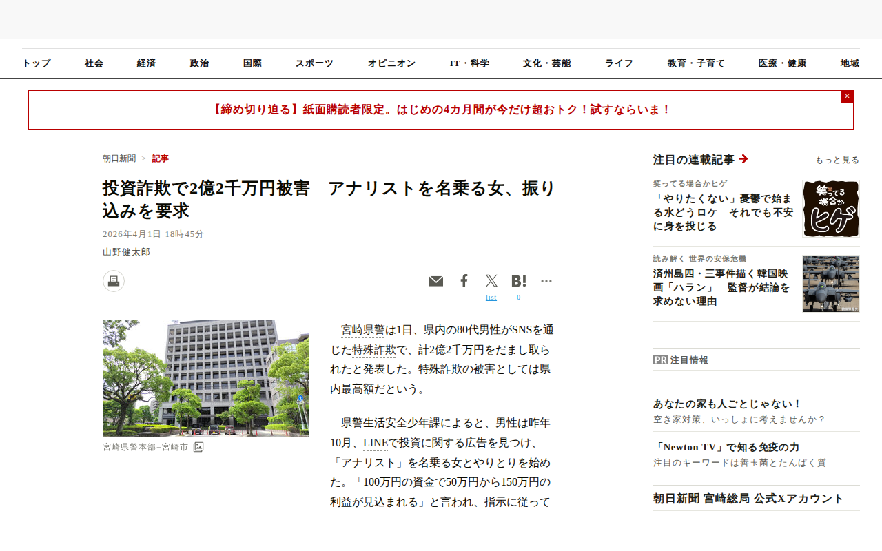 このページは、宮崎県の80代男性が特殊詐欺で2億2千万円をだまし取られた事件を報じています。男性はLINEの投資広告から「アナリスト」を名乗る女性と接触し、高利益を謳う投資アプリへの登録を勧められました。昨年12月から今...