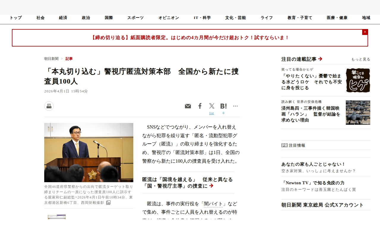 このページは、警視庁の匿流対策本部が全国46道府県警から新たに捜査員100人を受け入れ、匿名・流動型犯罪グループの取り締まりを強化する取り組みを報じています。匿流は、事件ごとにメンバーを入れ替えて犯罪を繰り返す組織で、特...