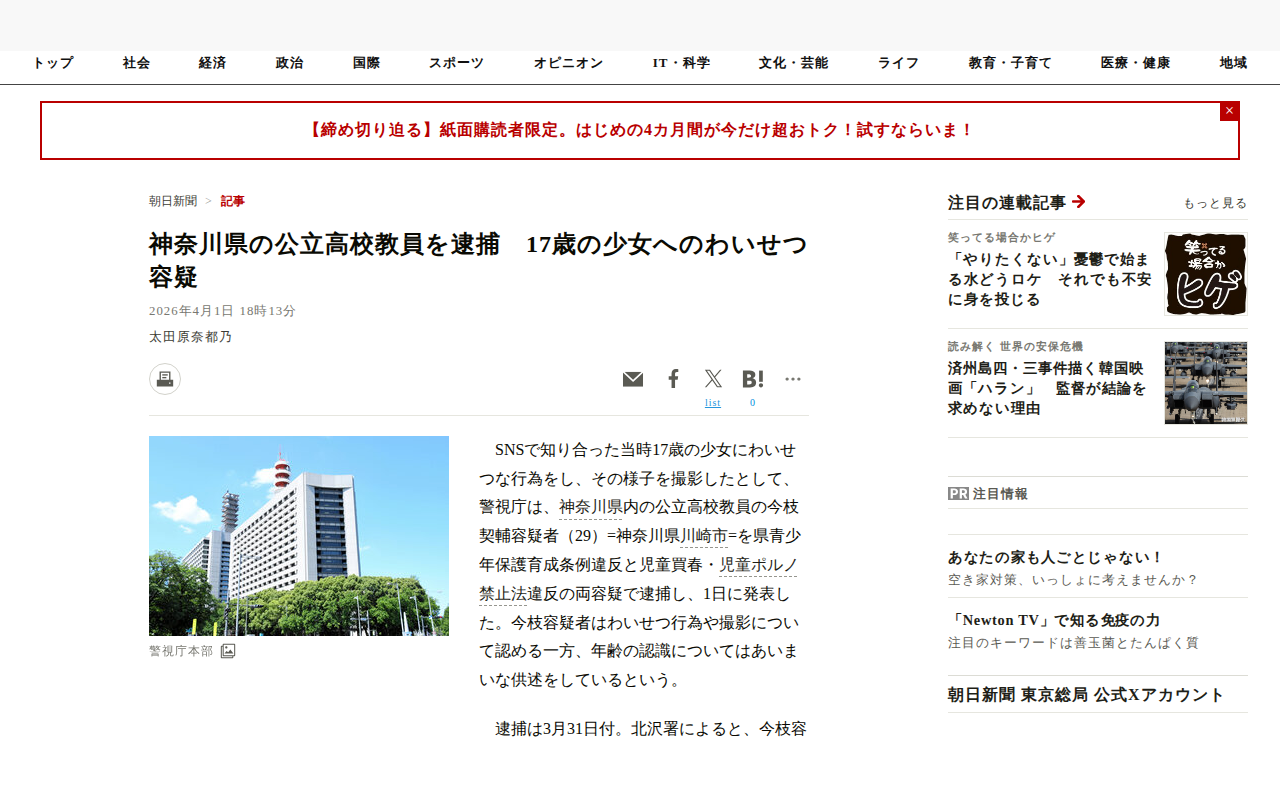このページは、神奈川県の公立高校教員が逮捕されたことを報じている。容疑者の今枝契輔氏(29)は、SNSで知り合った当時17歳の少女にわいせつな行為をし、スマートフォンで撮影したとして、県青少年保護育成条例違反と児童買春・...